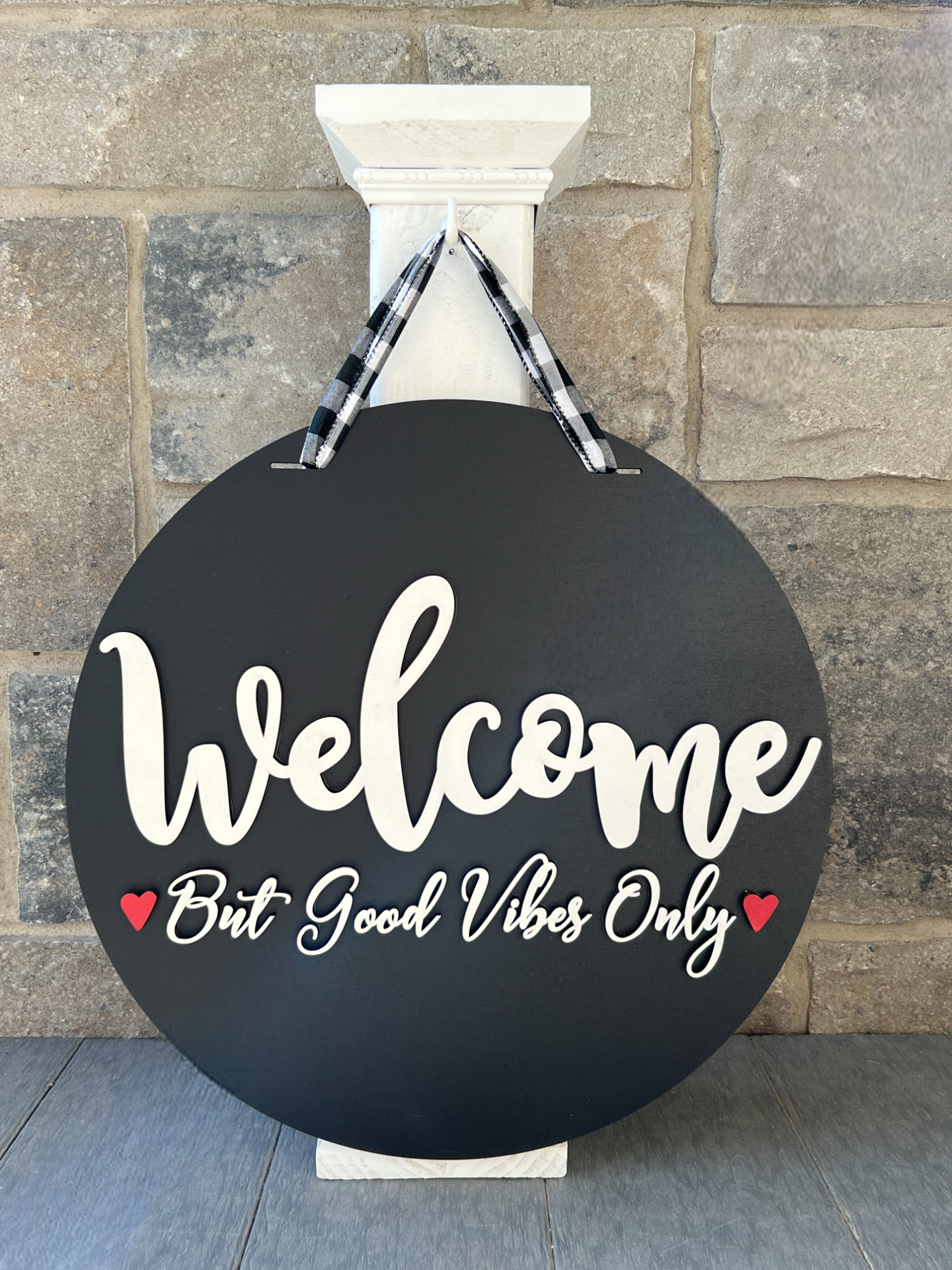 This door hanger is a 16" round, 2 layer sign that really pops and can be hung on a door or wall. The length of ribbon is easily adjusted by adjusting the knots on the back.