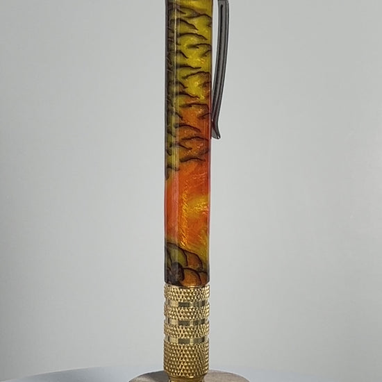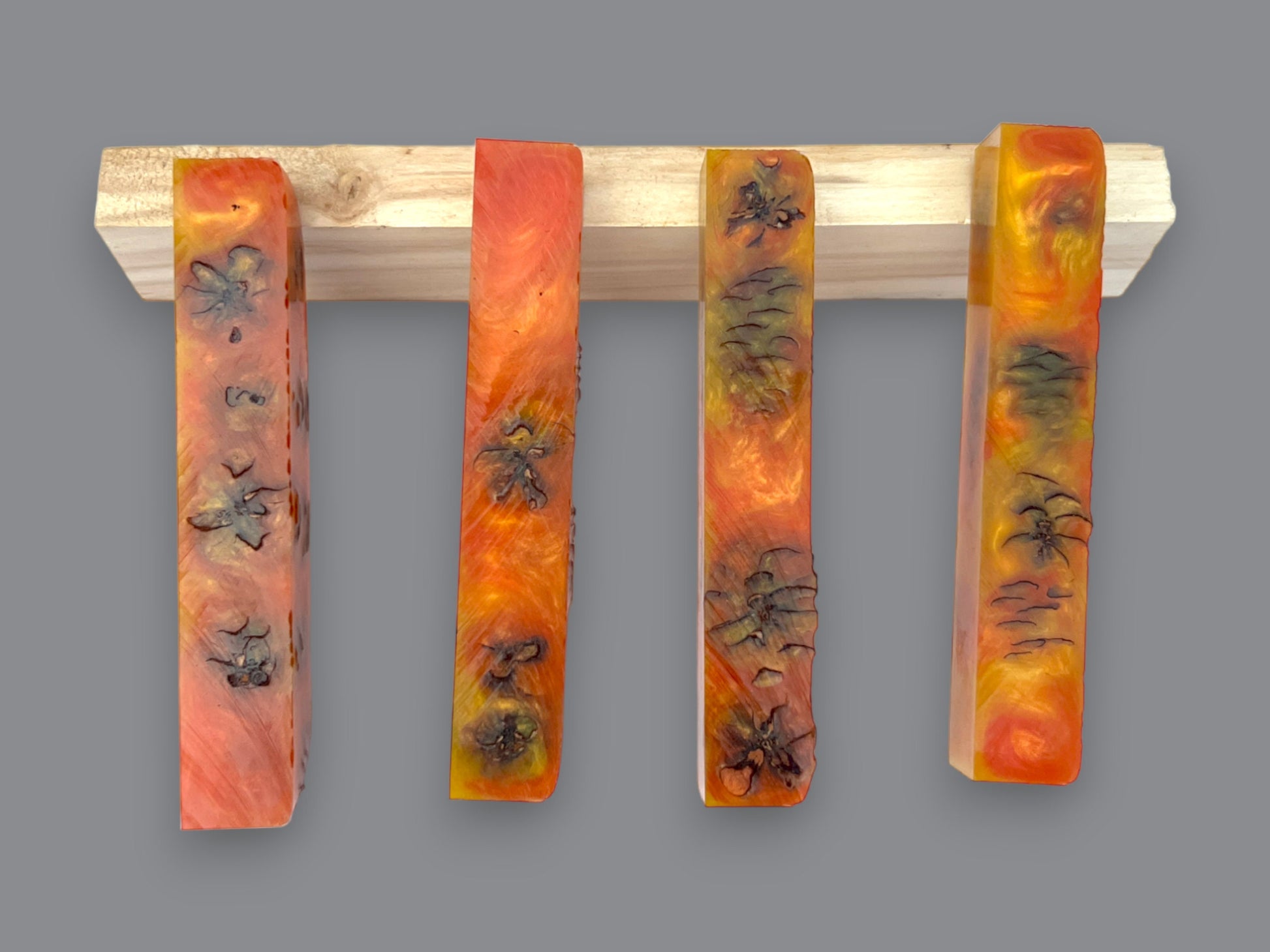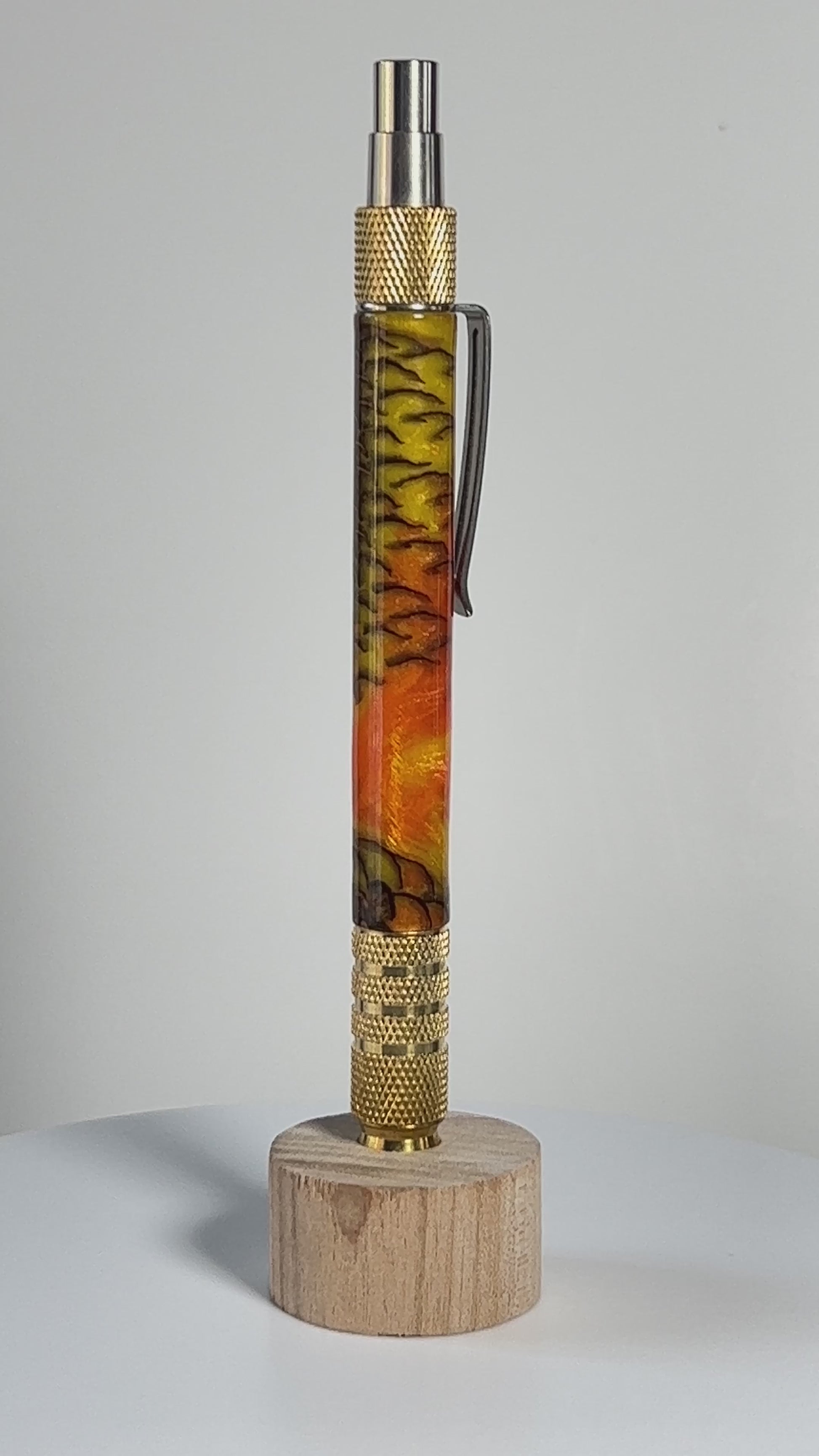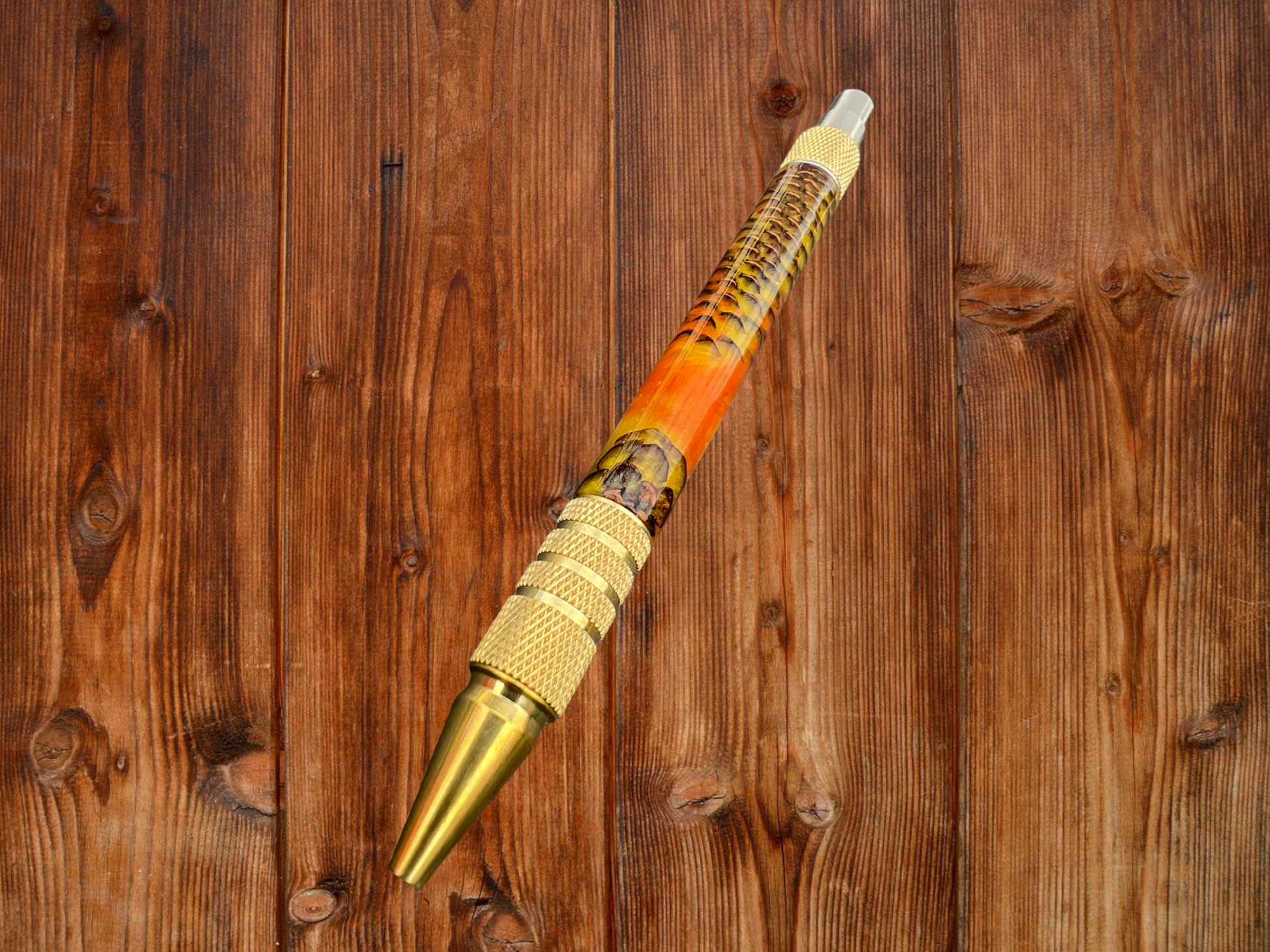 These gorgeous Campfire Hybrid pen blanks are yellow and orange in color with pinecones, the colors have a nice glitter and sheen to them as you can see in the pictures. You can see what the blanks look like once turned in the picture and video of the pen that I turned.