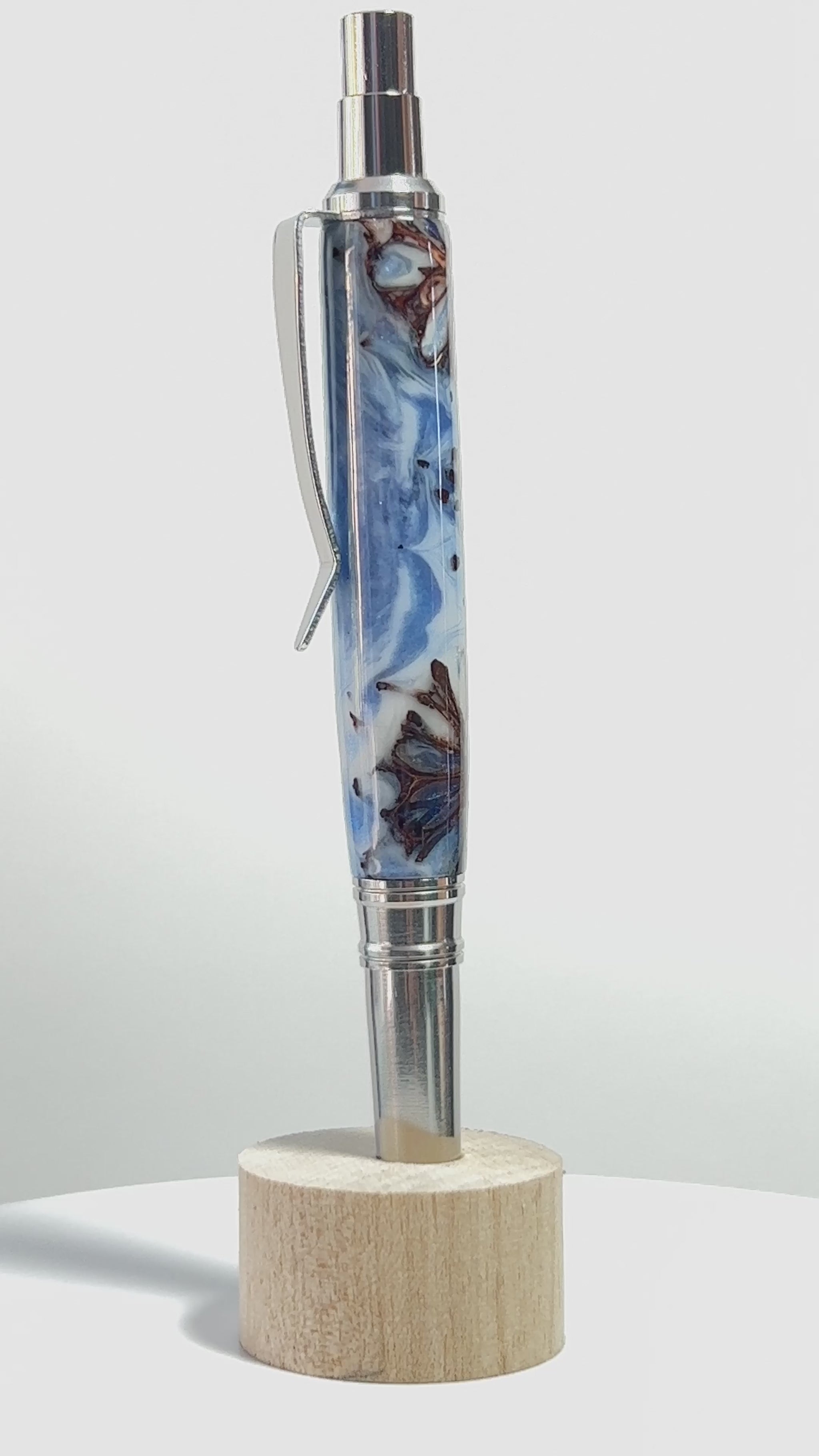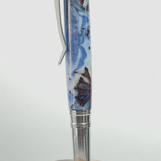 These gorgeous Cloud Burst Hybrid pen blanks are blue and white in color with sugargum tree seed pods, the colors have a nice glitter and sheen and swirl like clouds in a blue sky as you can see in the pictures. You can see what the blanks look like once turned in the picture of the pen that I turned.