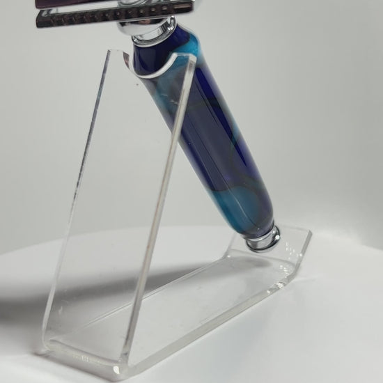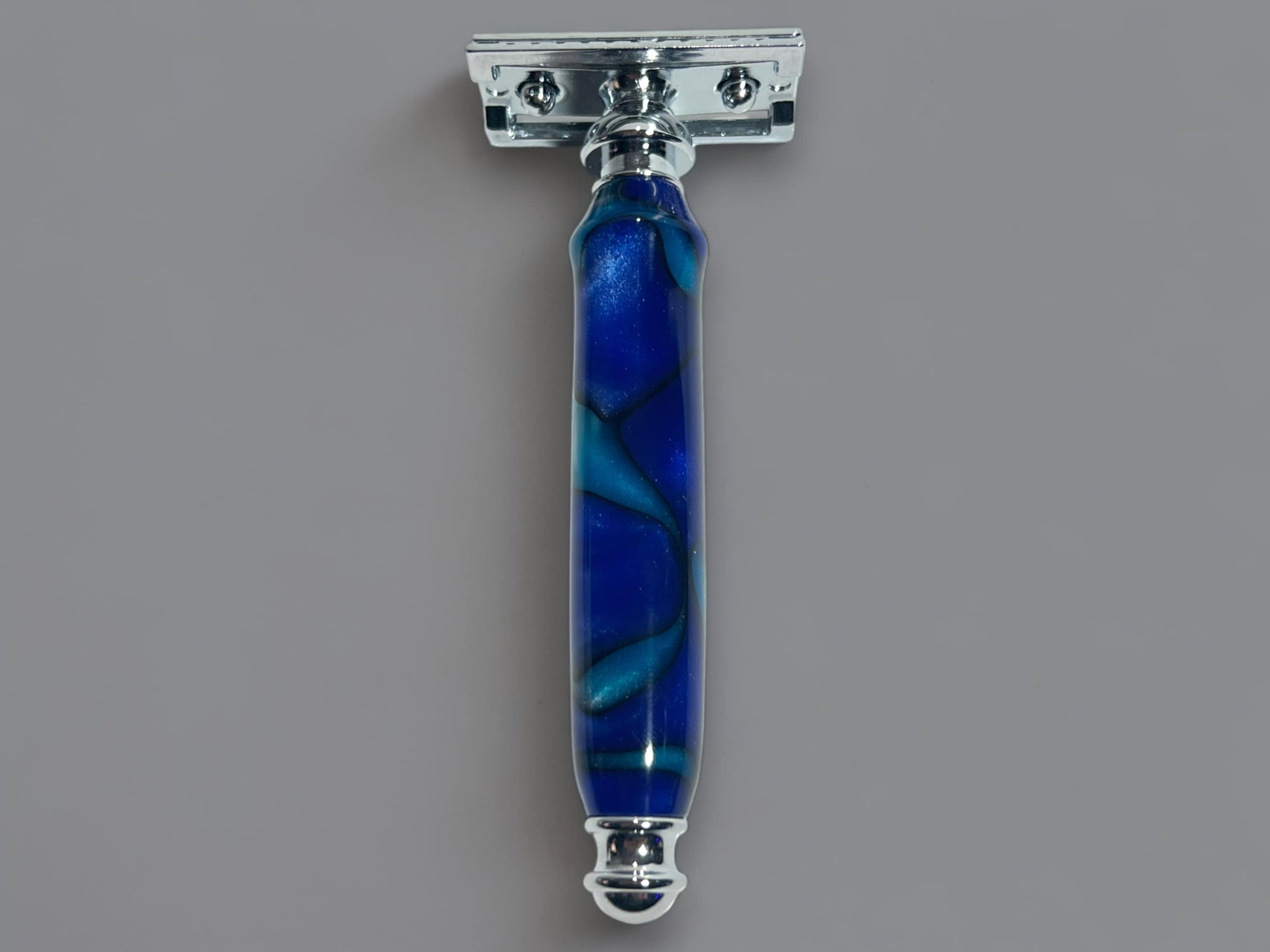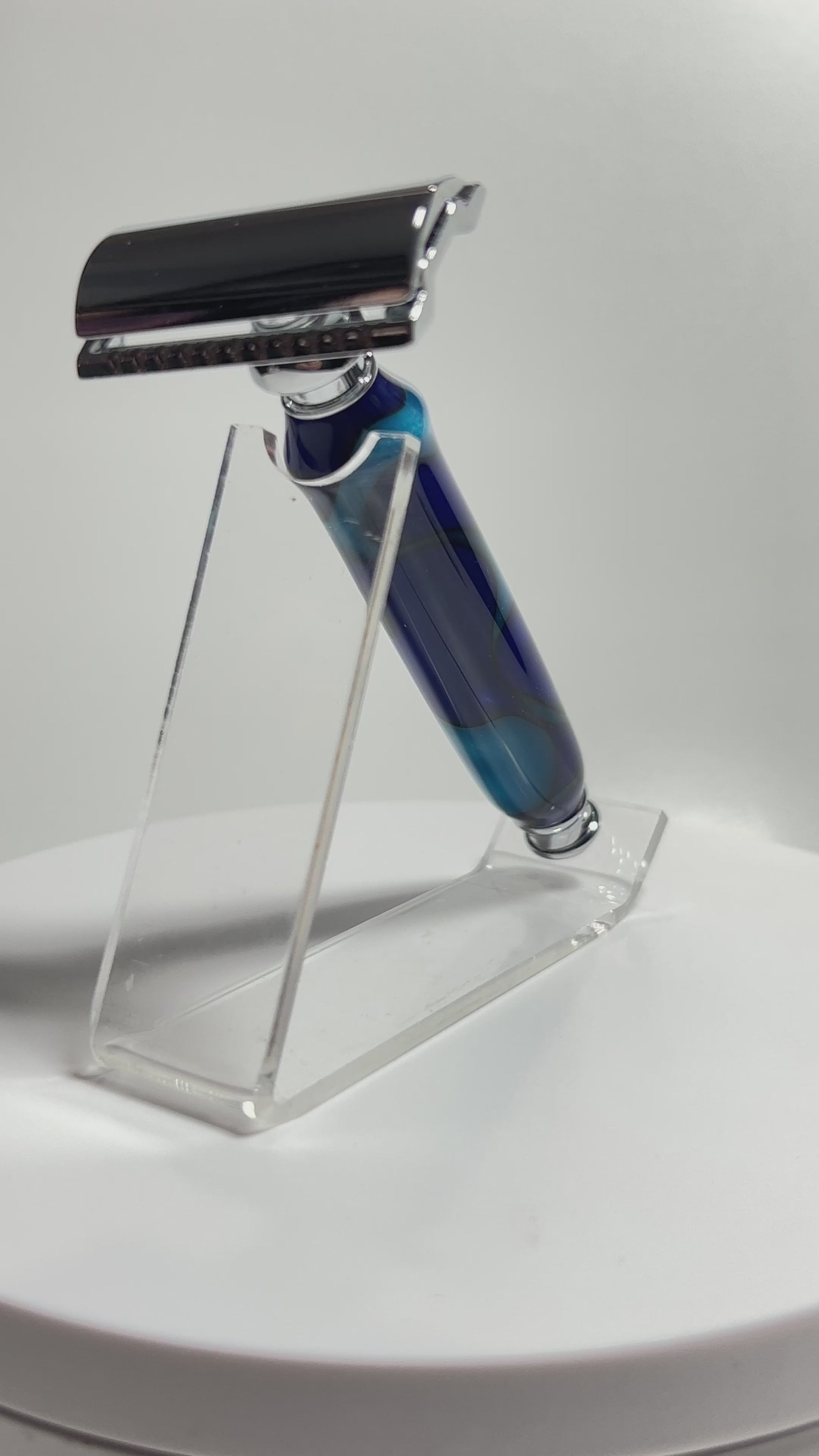 The body of razor handle is hand turned by me from a Turquoise Aqua Wave acrylic blank with amazing swirling pattern, making this handle a true one of a kind piece.
